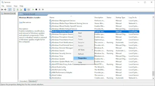 - Locate and right-click on the “Windows Modules Installer” service, then select “Properties.”